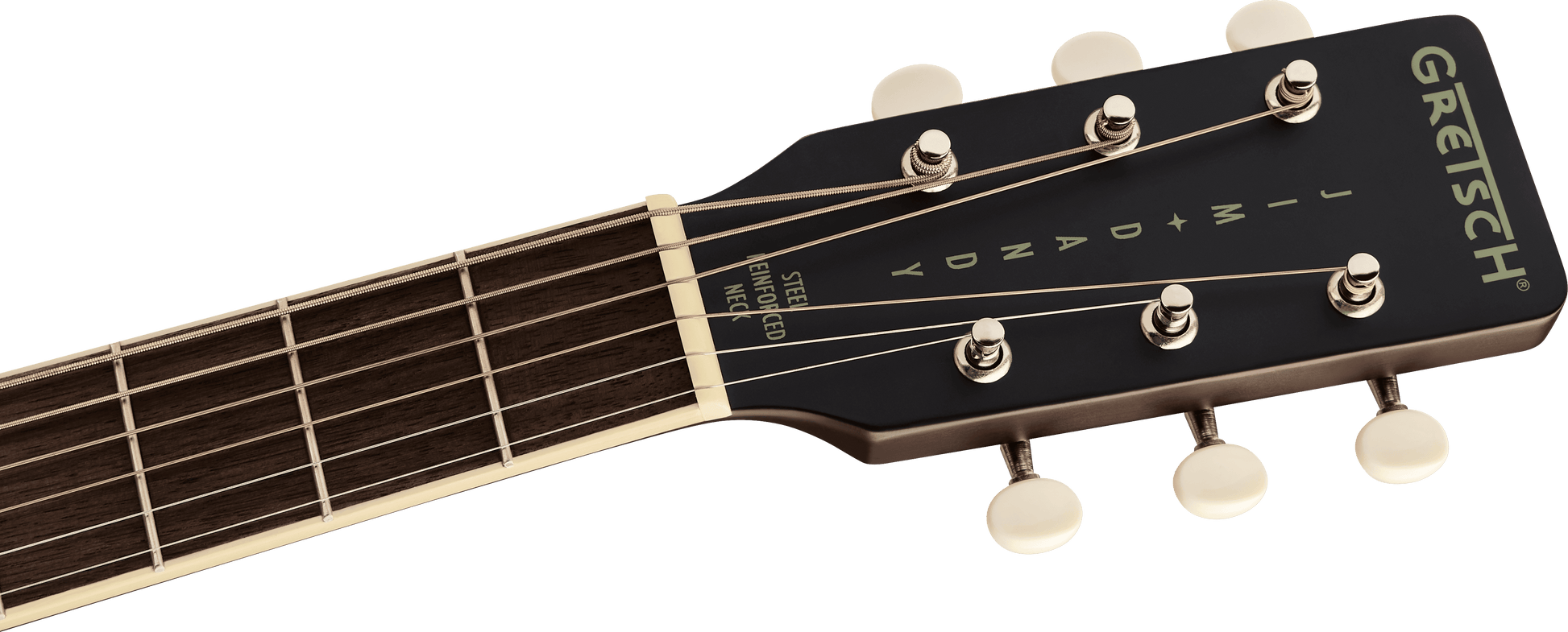 El cuerpo con refuerzo en X está fabricado con maderas laminadas ligeras seleccionadas para lograr un equilibrio óptimo entre un tono vintage cálido y una durabilidad excepcional, mientras que el mástil en forma de "C" ofrece una sensación acogedora para disfrutar de horas de inspiración clásica. Incluye detalles de época como un puente fijo de estilo vintage, golpeador con el logotipo "G", fileteado pintado a rayas y clavijas de afinación de 3 en línea. Los clavijeros de engranajes abiertos y las incrustaciones de puntos sobredimensionados en el diapasón se combinan para crear una personalidad nostálgica, ideal para cualquier concierto o jam session.